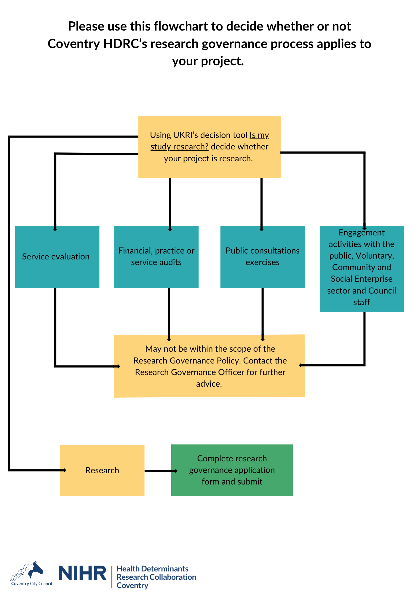If you are unsure whether the Research Governance Process applies to your project, please contact the Research Governance Officer at: CoventryHDRC@coventry.gov.uk